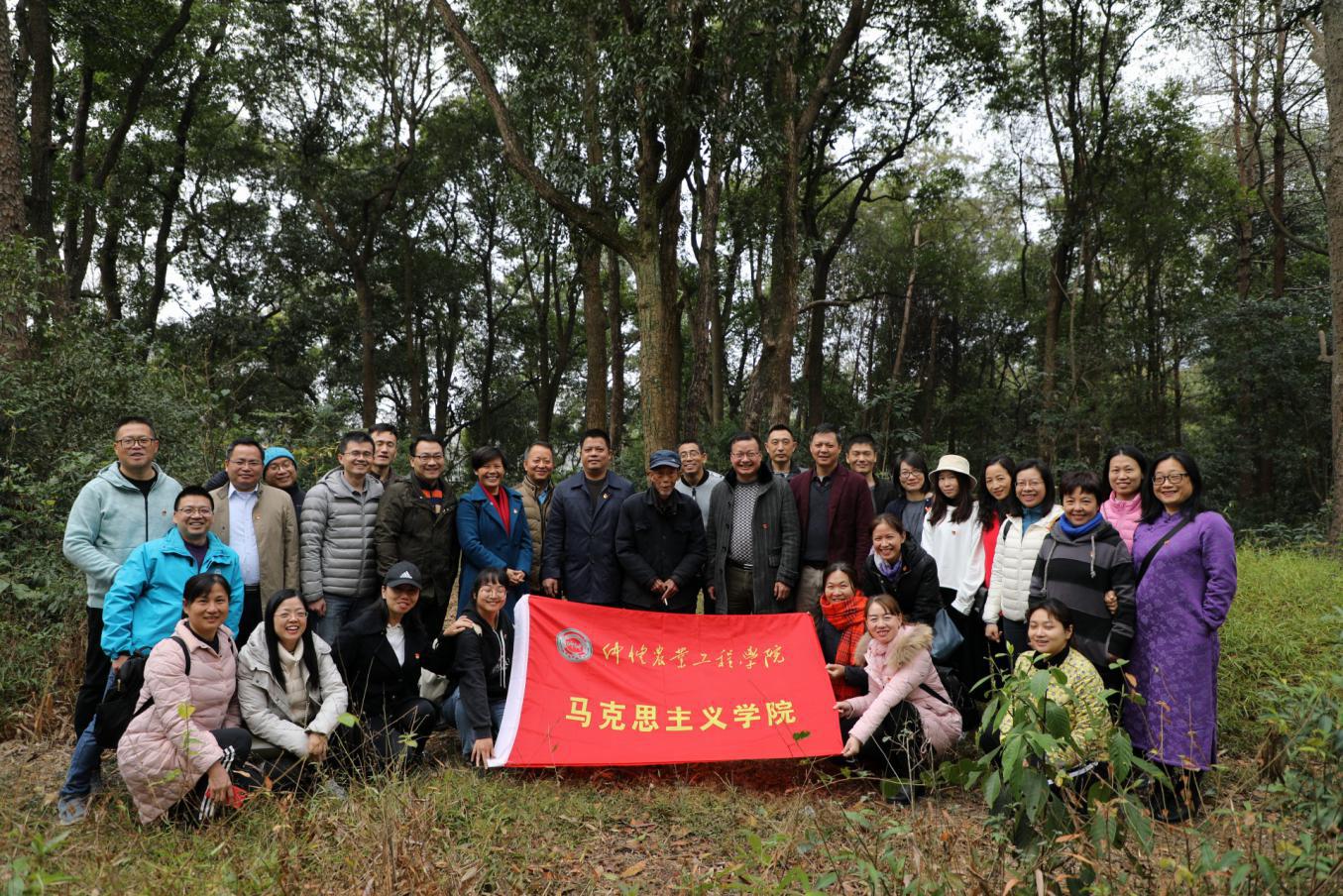 目前,仲恺师生寄宿的旧址等已被挂牌保护,全体党员沿着崎岖的山路、蜿蜒而上,探寻位于山坡上的仲恺办学旧址。沧海桑田,青山依旧。办学旧址之上,年份久远,苍翠挺拔的青松矗立如诉,当年用杉木皮和树枝搭建而成的教室和办公室已经不复存在,操场已经种上了庄稼。邱亚洪副书记表示要注重相关遗迹保护,并嘱咐党员同志要认真严谨地研究仲恺艰苦办学历史,充分准确地挖掘其精神内涵和现代价值。据校友介绍,当地政府正积极筹措将我校在乐昌的办学旧址与中山大学坪石办学点等合并一起创建研学基地,让更多粤港澳青年在走访中感知这段三地共同办学的教育史和抗战烽火岁月。