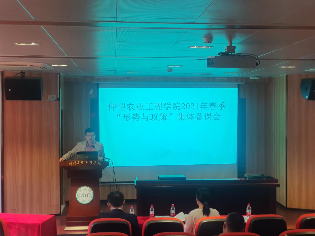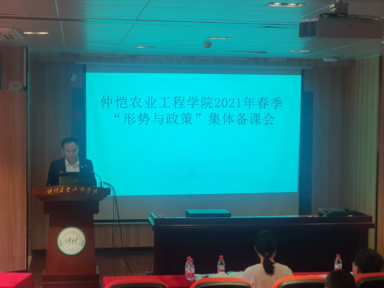 为深入学习贯彻习近平新时代中国特色社会主义思想和2021年全国“两会精神”,提升“形势与政策”课质量和水平,根据《广东省教育厅办公室关于2021春季“形势与政策”课备课会的通知》、《广东省教育厅关于做好2021春季学期高校党委书记、校长和院(系)党组织书记、院长(系主任)及中小学党组织书记、校长上第一堂思政课工作的通知》、《关于做好各学院党总支书记、院长上第一堂思想政治理论课工作的通知》(仲党办字[2021]8号)以及学校的相关制度,伟德国际英国于4月9日在英东楼111学术报告厅举办了2021春季学期全校“形势与政策”课集体备课会。会议由蔡立彬院长主持,秦抗抗副院长介绍本学期“形势与政策”课教学安排,形势与政策教研室施张兵、向丽和李晓燕等三位专任教师做示范教学。