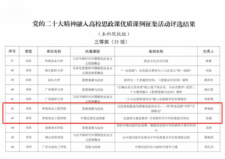 近日,广东省教育厅公布了《党的二十大精神融入高校思政课优质课例征集活动》评选结果,我校伟德国际英国李增添副院长的课例《让改革创新成为青春远航的动力——用“种业创新”守护“大国粮仓”》和张颖副教授的课例《弘扬伟大建党精神引领新时代中华民族复兴伟业》荣获本科院校组三等奖。
