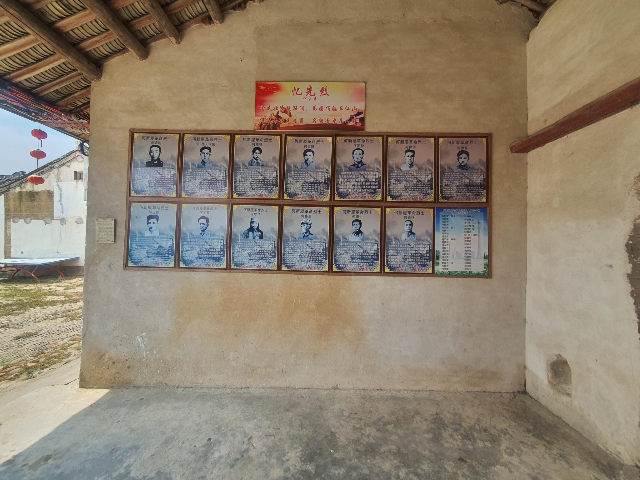 随后,团队一行来到位于大湖镇的何新屋。在何新屋翻新改造理事会何秘书长的带领下,团队领略了这座围龙屋深厚的红色文化底蕴。在何新屋东门楼阁的两面墙上,至今仍有清晰可见的弹痕。保存完好的东门楼角为抗日战争年代抗击伪军战役指挥部旧址。此外,何新屋的居民中曾有13人牺牲在解放战争的战场上。